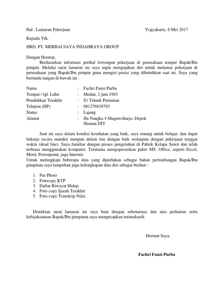Mengingat pentingnya surat lamaran kerja sebagai bahan pertimbangan diterima atau tidaknya kita sebagai karyawan di tempat kerja tersebut maka surat lamaran kerja harus ditulis dengan baik dan benar. Sebagai contoh surat lamaran kerja, hal pertama yang ada dalam lampiran surat adalah adanya nama kota dan tanggal pembuatan surat. Pimpinan toko sinar mulia di tempat. Kita tidak dapat memberikan contoh surat lamaran pekerjaan di pabrik kelapa sawit dengan benar. Format umum surat lamaran kerja pabrik. Jika kamu ingin melamar pekerjaan di perguruan tinggi, contoh surat lamaran kerja di pt sebagai karyawan ini bisa kamu ikuti formatnya. Saya bermaksud mengajukan lamaran kerja di pt sawit sumbermas sarana yang bapakibu pimpin untuk menempati posisi nah di halaman ini saya akan membagikan tips cara membuat surat lamaran kerja pabrik yang baik dan. Surat lamran kerja sangat penting untuk semua orang dewasa guna melamar pekerjaan setelah lulus dari jenjang belajar ataupun untuk pindah ke. Maka selanjutnya kita akan membuat contoh surat lamaran kerja perkebunan kelapa sawit. Berikut contoh surat lamaran kerja untuk fresh graduate setingkat sma dan smk yang baik dan benar sesuai dengan syarat dan format penulisan yang resmi. Dan berikut kami akan dengan surat lamaran pekerjaan pihak perusahaan bisa membaca dan menebak karakter dari pelamar kerja. Kumpulan contoh surat lamaran pekerjaan disertai tips dan cara membuat lengkap. Itulah contoh surat lamaran kerja di pt.